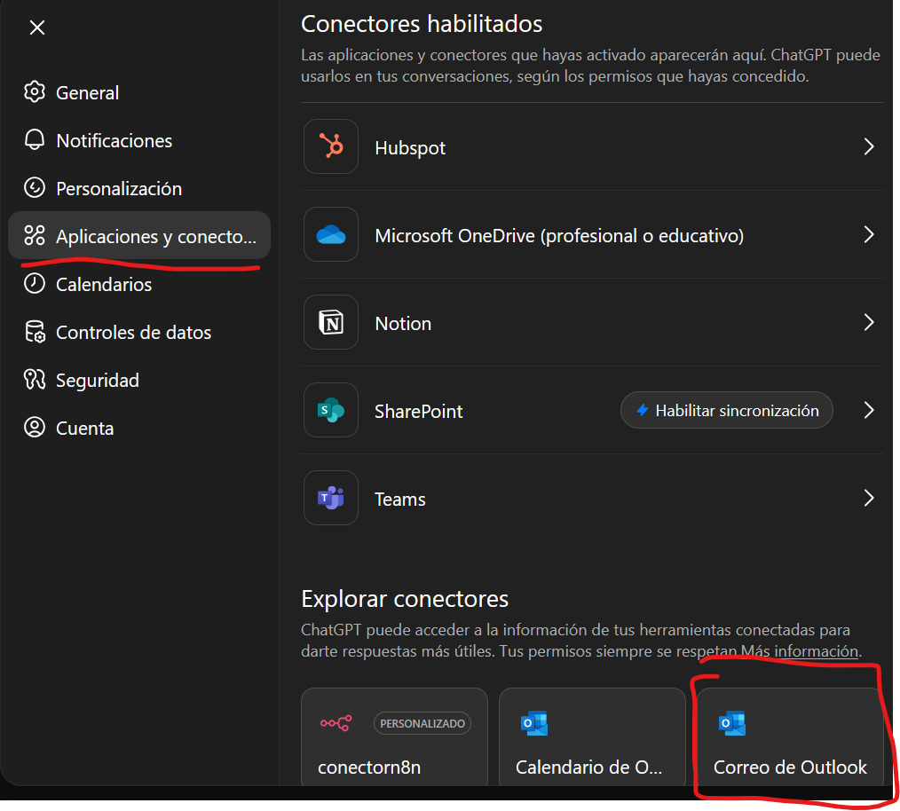 1. Habilitar el conector en /Personalización / Aplicaciones y conectores / Correo Outlook