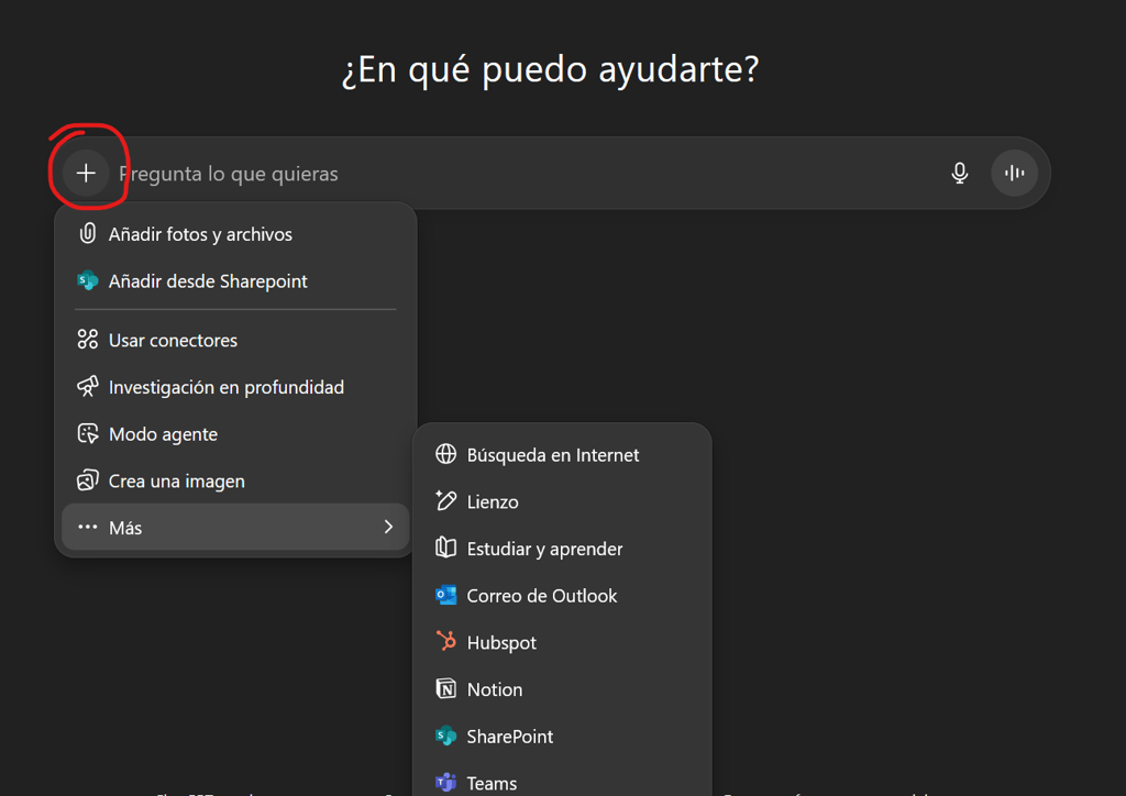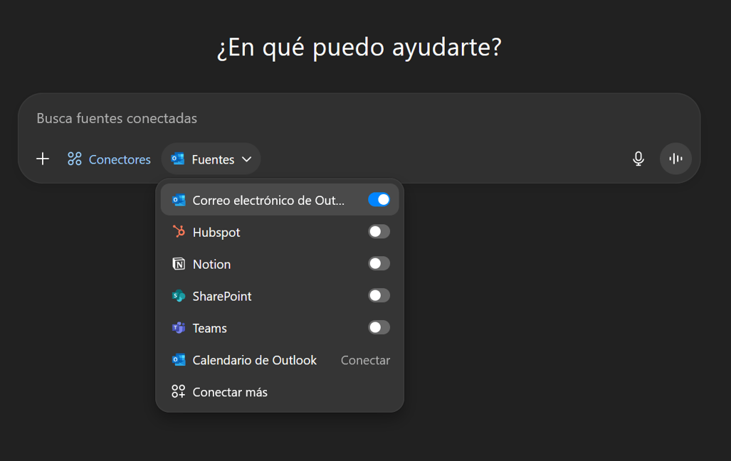 Ya podemos realizar el ejercicio, habilita tu conector mediante las opciones en "+" del chat y selecciona la fuente que quieres usar, en este caso "correo electrónico de outlook", asegurate de verlo con el conector activo como en la imagen de ejemplo.